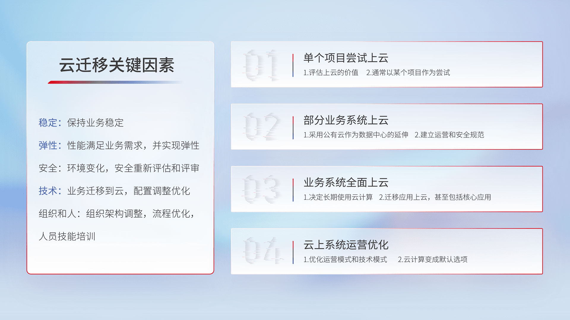 结合实际业务,,,从规划设计、、云平台选型、、、、云原生改造、、、、数据迁移、、、、集成交付,,迁移全过程为客户识别最佳上云路径,,,,做好风险识别管理,,,,设计网络架构、、身份权限、、、安全审计合规、、、操作审计、、日志审计、、、、监控告警策略、、、、多站点容灾设计等,,对云上基础设施进行整体规划,,,提升IT治理水平,,以满足弹性、、高可用、、、高性能的需求。。。
