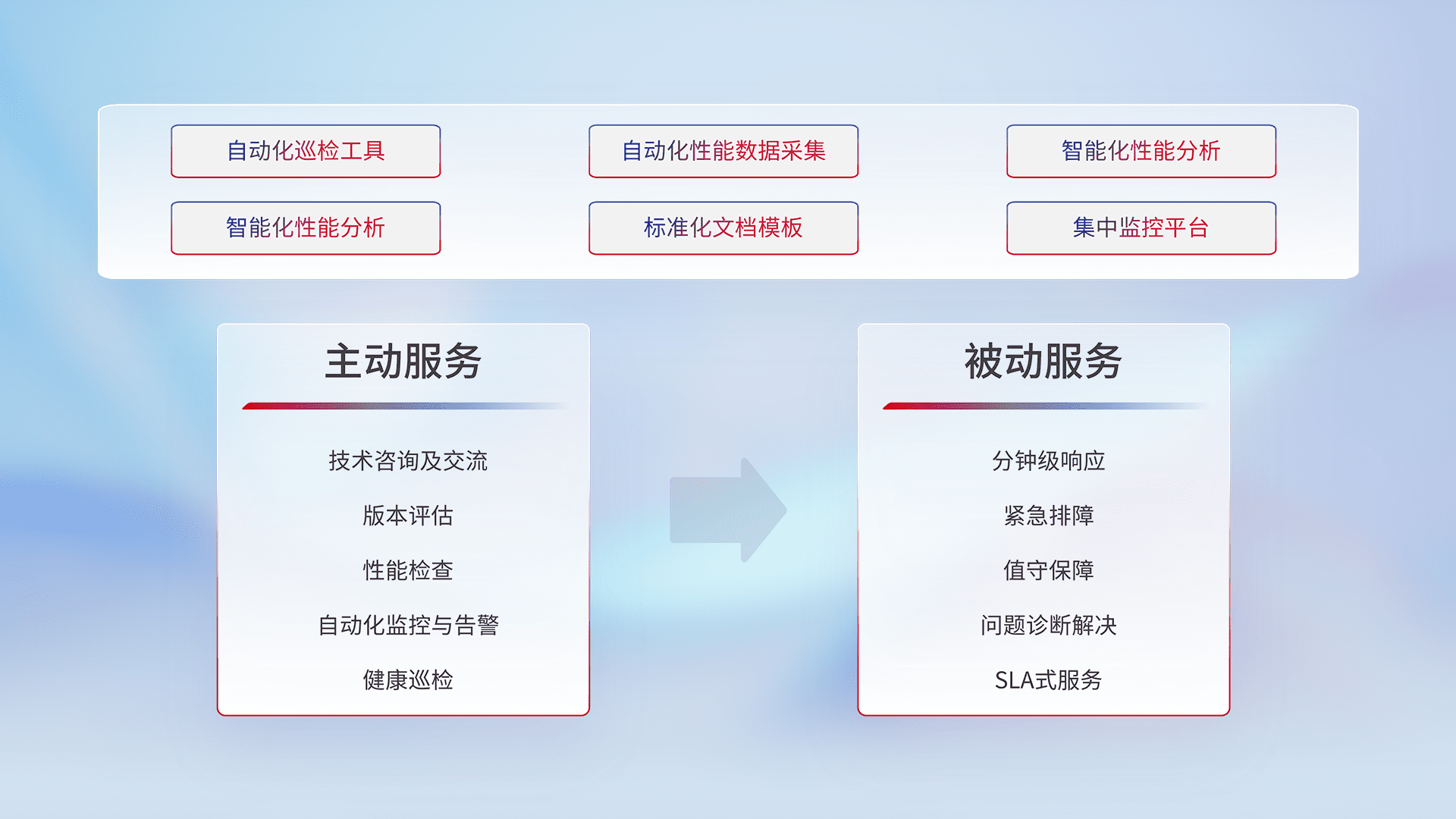 智能化工具和标准化文档,,,保障服务质量,,提供主动服务(包含技术咨询、、、、版本评估、、、性能检查、、、、自动化监控与告警、、健康巡检)和被动服务包含(分钟级响应、、紧急排障、、、值守保障、、、问题诊断解决、、SLA服务)。。。