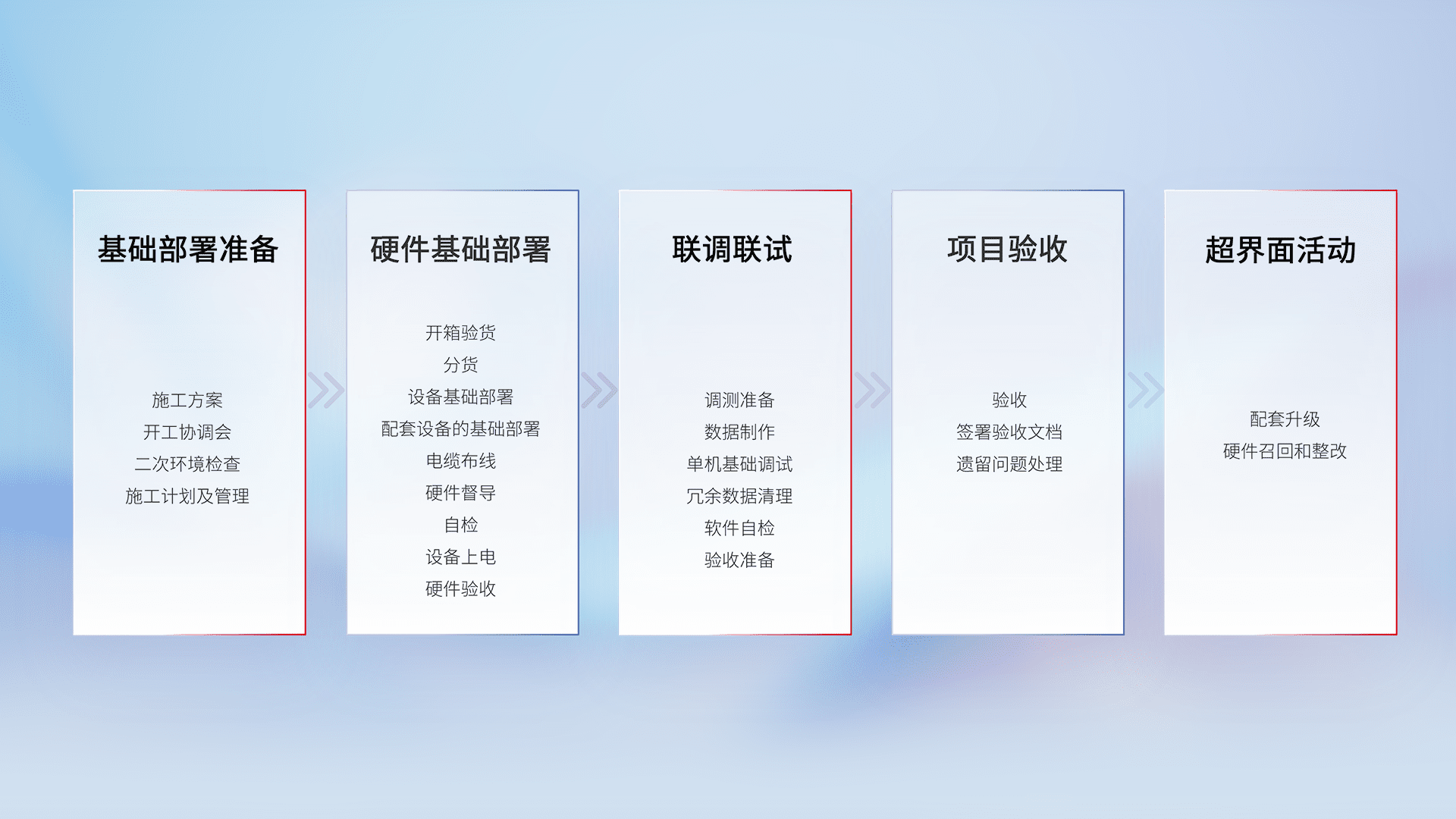 从基础部署准备、、、硬件基础部署、、联调联试、、、项目验收、、越界面活动的全过程可追溯,,保证施工质量和进度。。。